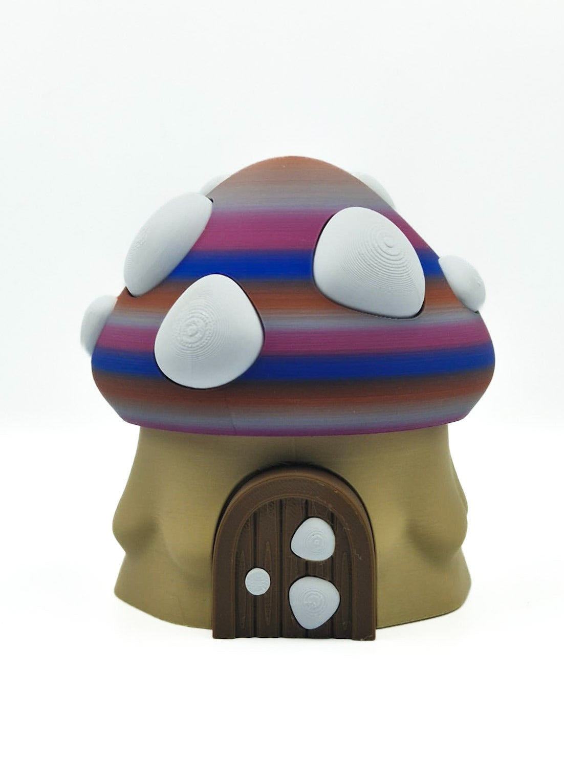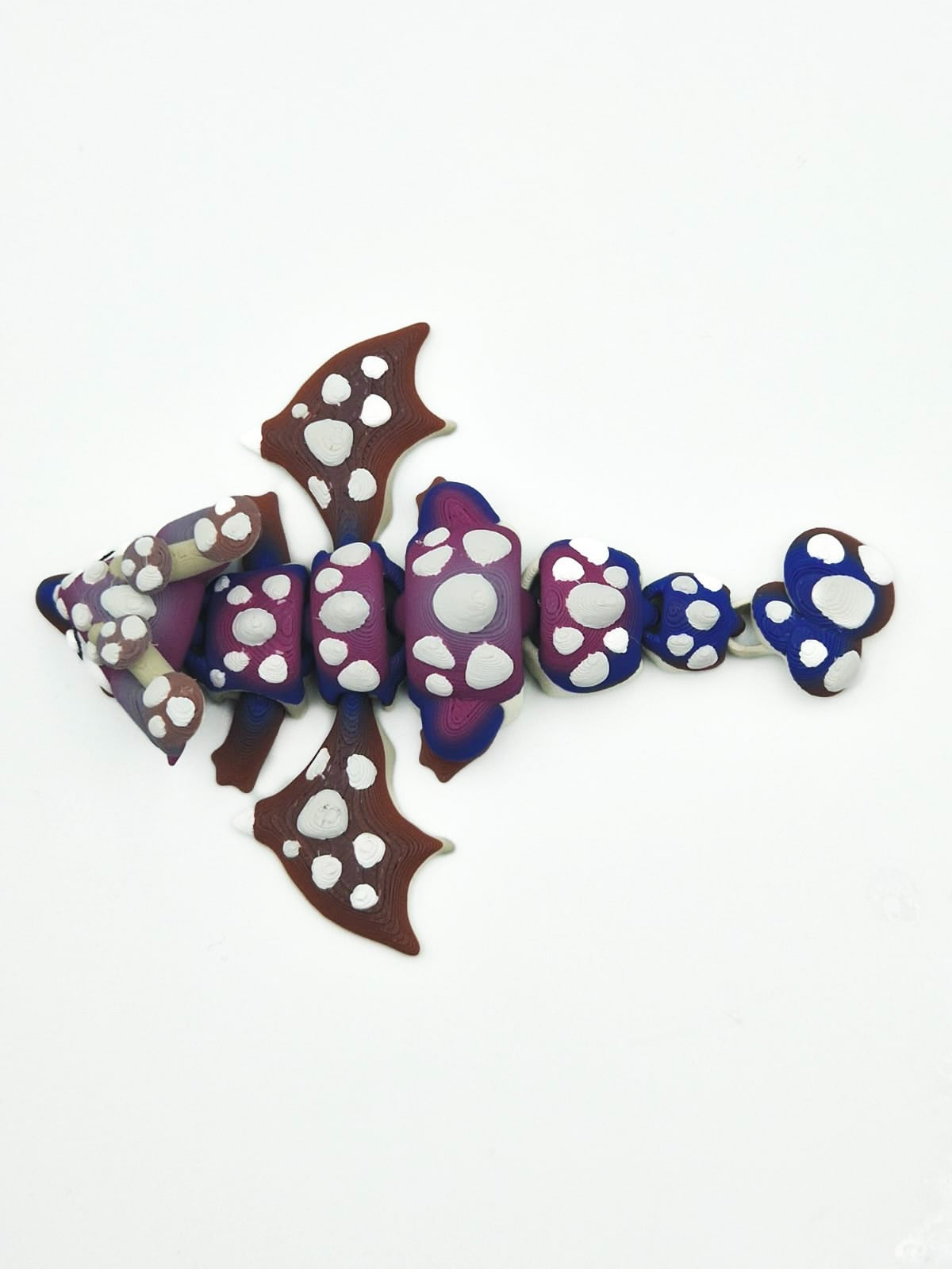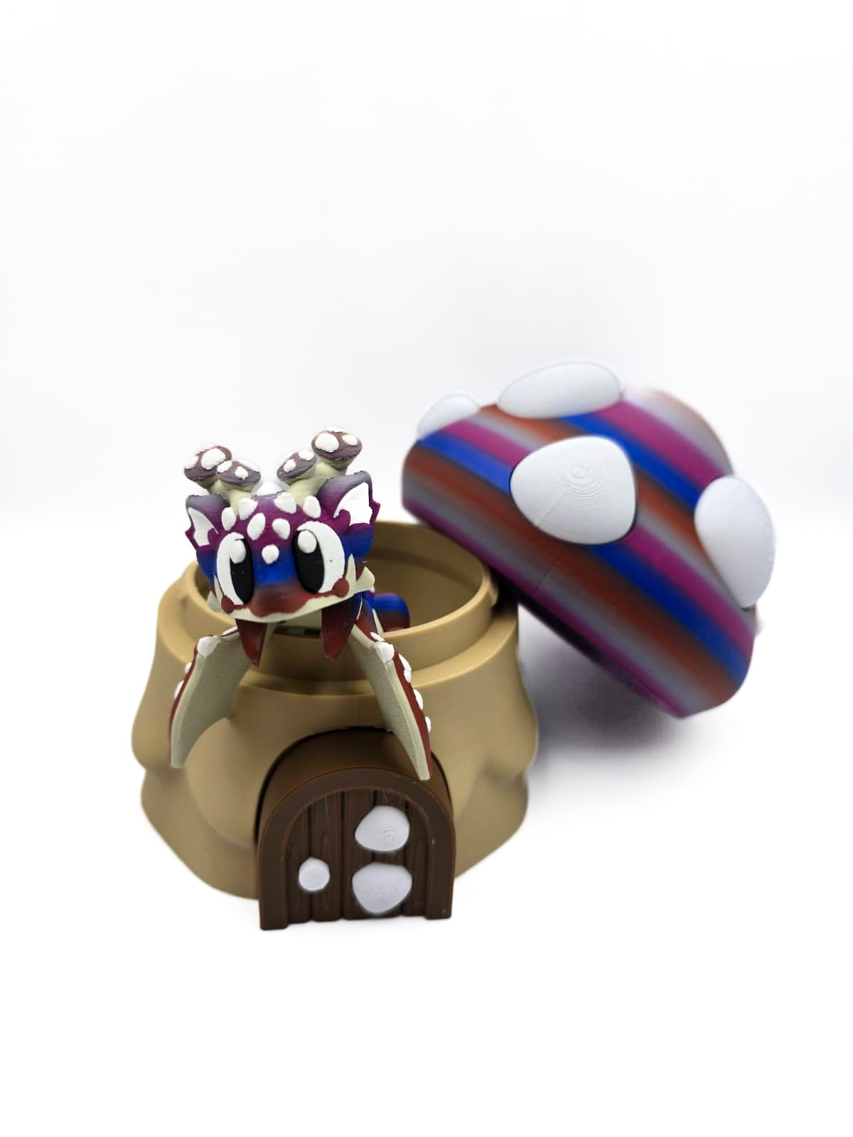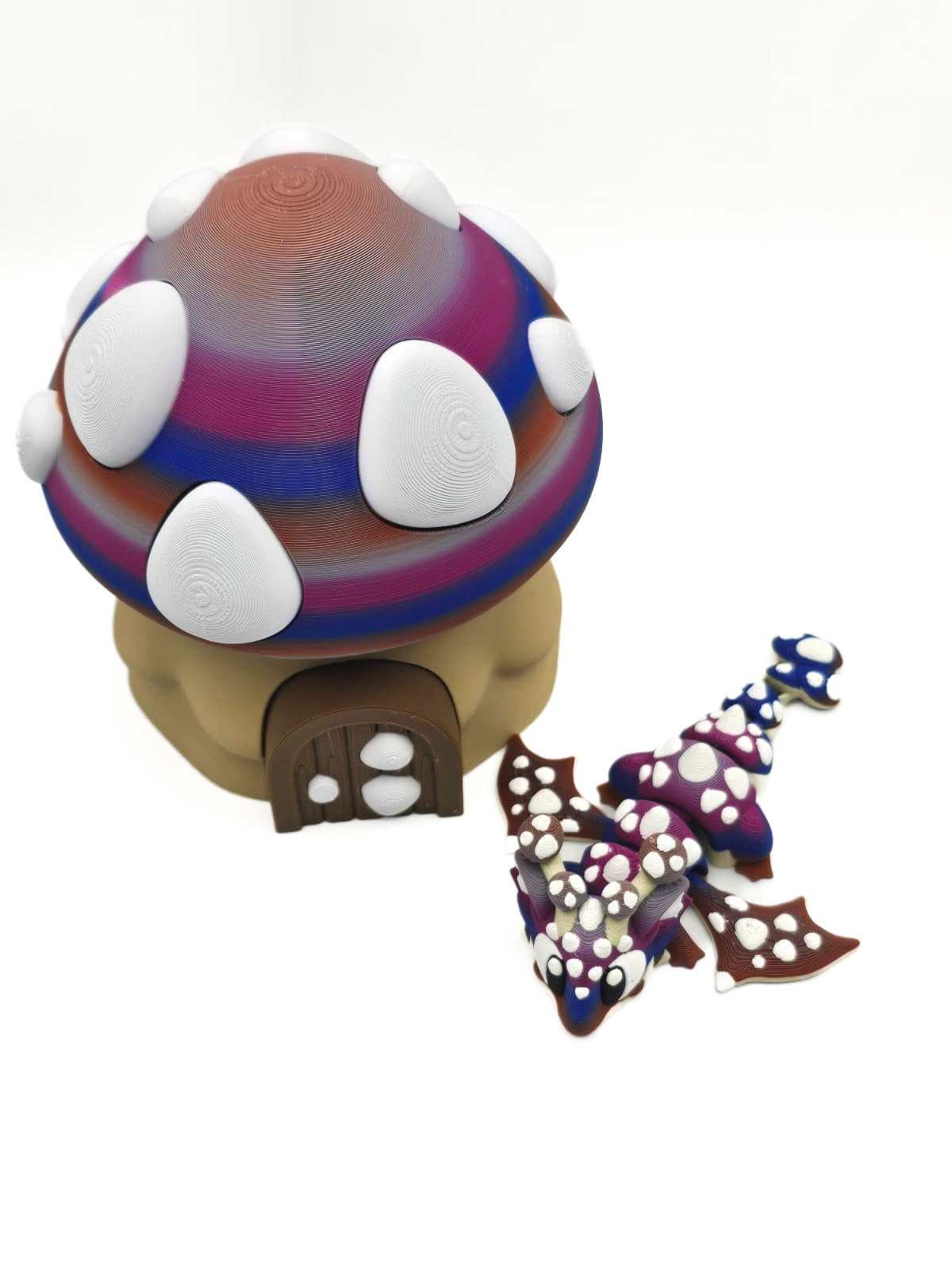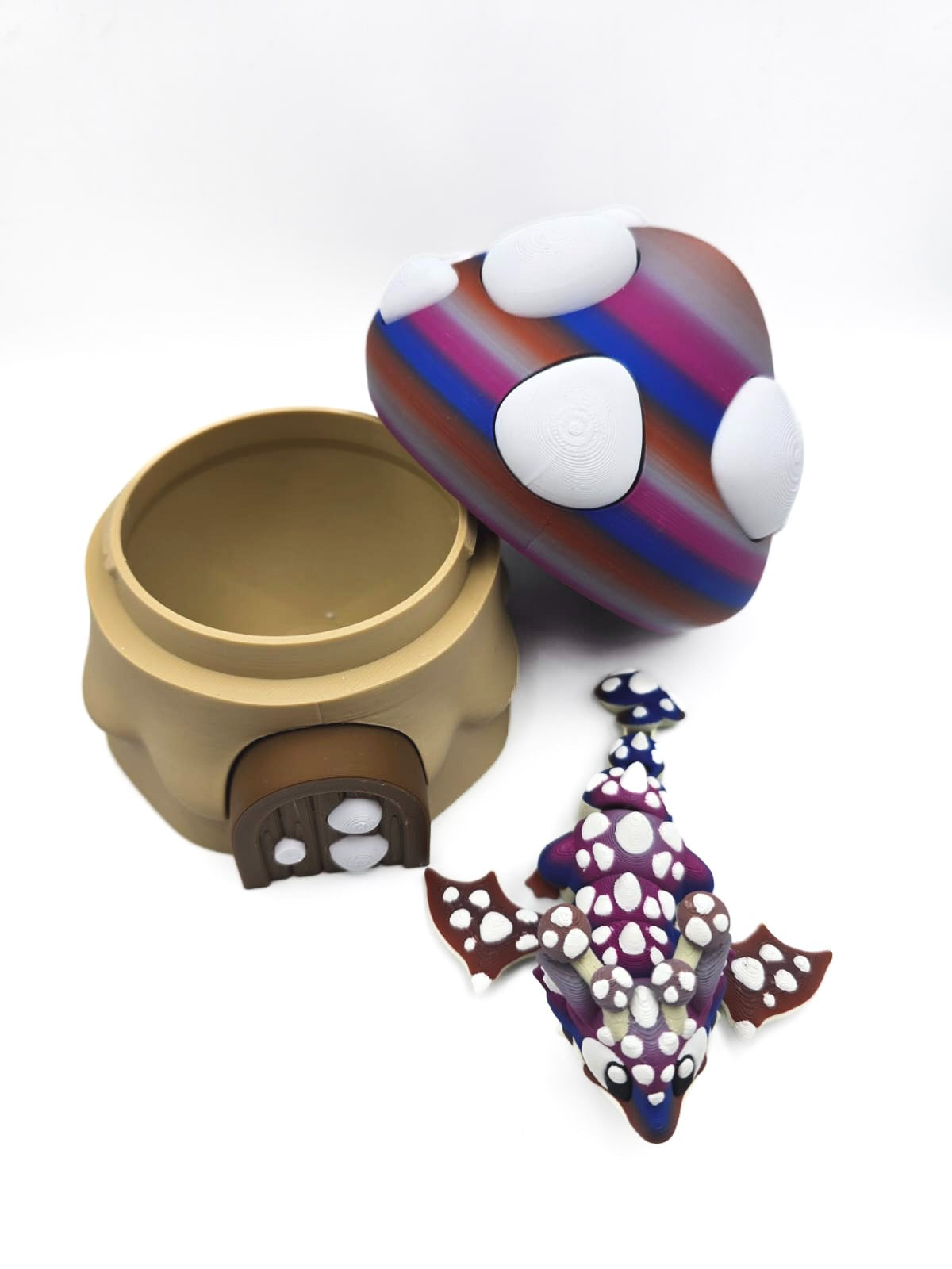 Stap binnen in een magische fantasywereld met dit 3D-geprinte Paddenstoel Draakje, inclusief bijpassend paddenstoelei! Dit unieke ontwerp combineert de charme van paddenstoelen met de mystiek van draken. De opvallende kleuren — met tinten paars, blauw en rood — vloeien prachtig in elkaar over, terwijl de witte “paddenstoel-stipjes” voor een sprookjesachtig effect zorgen.